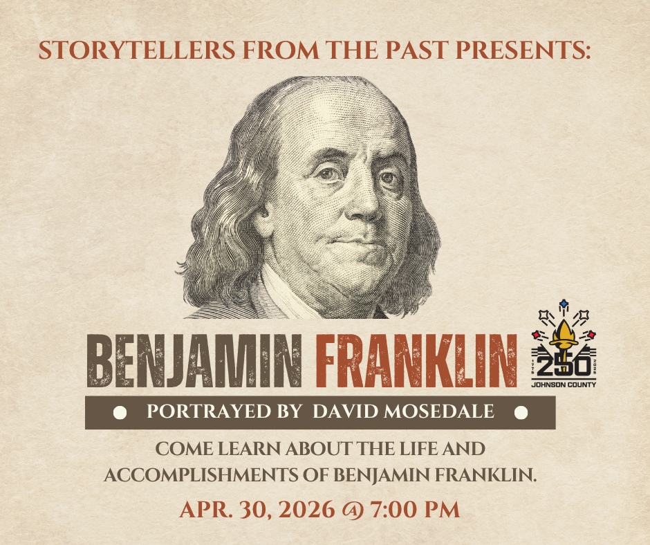On April 30 at 7:00 pm, we invite you to Custer Theater in Old Main on Franklin College’s campus for an engaging evening with David Mosedale as he portrays Benjamin Franklin. This lively presentation will explore Franklin’s life, accomplishments, and enduring influence in a memorable and informative way. This event is presented in partnership with the Johnson County Public Library.