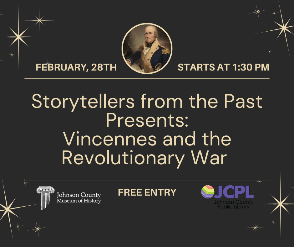 Our Storytellers from the Past program this year will all be America’s 250th themed. Chuck Valentine will portray a soldier in George Rogers Clark army during the only Revolutionary War battle in Indiana. The event is free and open to the public and co-sponsored by the Johnson County Public Library.